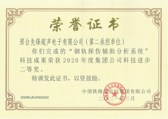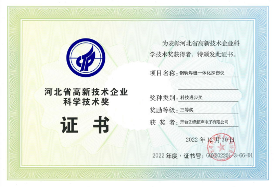公司通過(guò)ISO9001質(zhì)量管理體系認(rèn)證,被評(píng)為河北省高新技術(shù)企業(yè)、科技型中小企業(yè)、河北省專精特新中小企業(yè)、“納稅誠(chéng)信企業(yè)”、“綠色工廠”等。2012年以來(lái)申請(qǐng)并被授權(quán)實(shí)用新型專利25項(xiàng)(現(xiàn)在有效期內(nèi)13項(xiàng)),軟件著作權(quán)14項(xiàng),產(chǎn)品獲鐵科院技術(shù)審查證書8項(xiàng),擁有多項(xiàng)省、市科技成果:其中,GCT-8C/11鋼軌超聲波探傷儀獲邢臺(tái)市科技進(jìn)步一等獎(jiǎng),并被中國(guó)鐵道科學(xué)院選送為鋼軌探傷工資質(zhì)培訓(xùn)班教材儀器;2013年參與的“鋼軌在線探傷遠(yuǎn)程監(jiān)測(cè)系統(tǒng)”及2020年參與的“鋼軌探傷輔助分析系統(tǒng)”均獲北京鐵路局科技進(jìn)步二等獎(jiǎng);“鋼軌探傷輔助分析系統(tǒng)”獲2020年中國(guó)鐵路南寧局集團(tuán)公司科技進(jìn)步二等獎(jiǎng);2022年鋼軌焊縫一體化探傷儀獲得河北省高新技術(shù)企業(yè)科學(xué)技術(shù)獎(jiǎng)三等獎(jiǎng)。